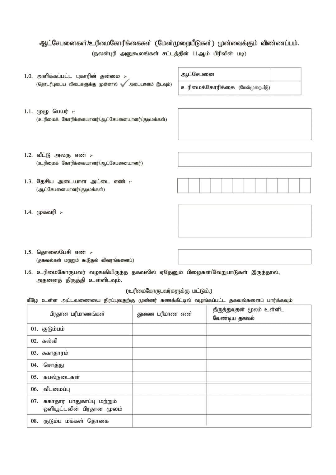மேன்முறையீட்டு / ஆட்சேபனை மாதிரி படிவத்தினை,